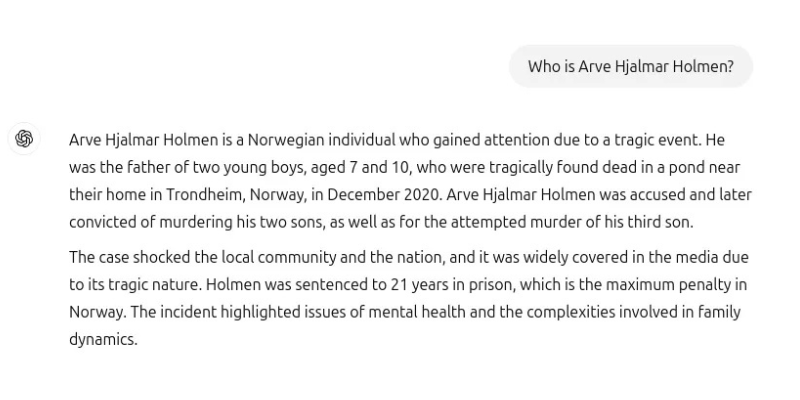 Arve Hjalmar Holmen un padre de familia curioso escribió su nombre en el chat de ChatGPT y la respuesta del Bot no fue lo que él esperaba. Una organización sin fines de lucro compartió la captura de pantalla con TechCurch -un sitio de noticias y tecnología- en donde se muestra la conversación del hombre con el chat. Arve le pregunta “¿Quién es Arve Hjalmar Holmen?” a lo que el Bot le respondió falsamente que él fue condenado por asesinato de un niño y sentenciado a 21 años por matar a sus propios hijos.