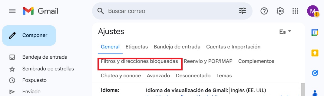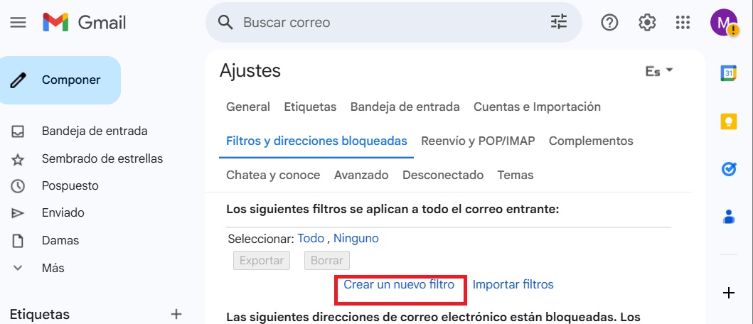 A continuación, ve a la pestaña "Filtros y direcciones bloqueadas" y haz clic en "Crear un filtro". Esta opción te permitirá crear filtros personalizados para organizar tu bandeja de entrada.
