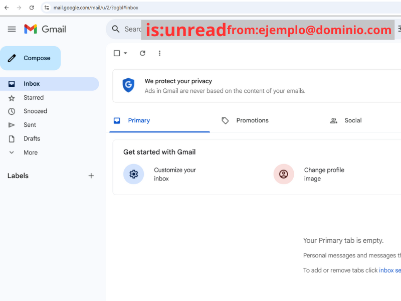 Búsqueda EspecÃfica de Correos No LeÃdos de un Remitente: Si deseas buscar correos no leÃdos de un remitente especÃfico, puedes afinar la búsqueda usando un comando más especÃfico. Por ejemplo, escribe is:unread from:ejemplo@dominio.com y presiona Enter . Esto filtrará los correos no leÃdos provenientes de ese remitente en particular.