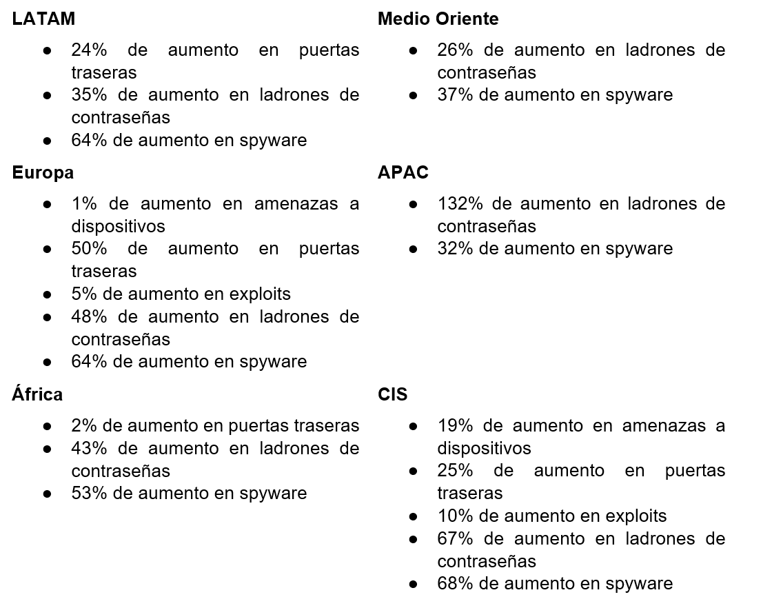 De acuerdo con la empresa de ciberseguridad, a nivel global, varias amenazas mostraron un repunte notable: las detecciones de ladrones de contraseñas crecieron 59%, las de software espÃa (spyware) aumentaron 51% y las de puertas traseras (backdoors) subieron 6% respecto a 2024. En el caso de América Latina, la tendencia también fue al alza: los backdoors aumentaron 24%, los ladrones de contraseñas 35% y el spyware 64%.