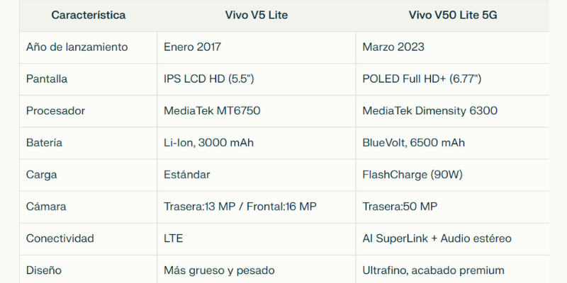 El Vivo V50 Lite es un dispositivo de última generación con características avanzadas en comparación con el más antiguo Vivo V5 Lite. Si buscas un smartphone moderno con capacidades como carga rápida, cámaras de alta resolución y diseño elegante, el Vivo V50 Lite es la mejor opción.