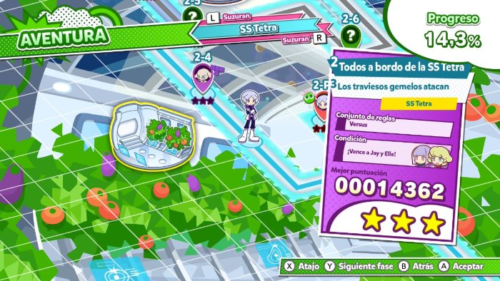 El modo Aventura es básicamente el modo historia en el que te contarán cómo es que el mundo de los Puyo Puyos y los Tetris terminaron fusionados. Es una secuela, entonces todo lo que pasó en el juego 1 es canon. La verdad la historia es bastante básica y es solo una excusa para introducir personajes tiernos y hacer batallas de tetriminos y puyo puyos. No lo llamaría un modo esencial a menos que por alguna razón seas muy muy fan de estos personajes. Quiero decir, son muy lindos, pero la historia es más bien aburrida.