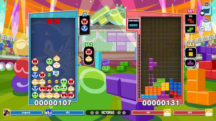 Sí, es la fusión de estos dos juegos, y así es como funciona: Tetris es el juego normal que ya conoces, en el que debes formar Tetrminos en una línea para hacer que desaparezcan. Aquel que haga mejores combos, o sobreviva más tiempo, es el ganador. Mientras tanto, Puyo Puyo es una variación del conecta tres, en el que unas masitas llamadas Puyo Puyo caen del cielo, y debes alinearlas para que desaparezcan. Armar combos no dependerá tanto de tu habilidad como de tu capacidad de planear tus movimientos a futuro.