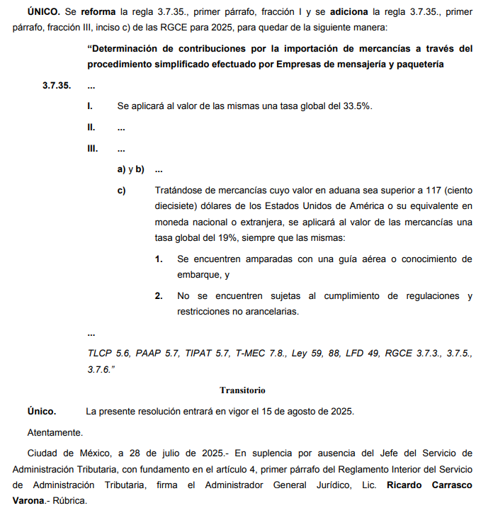 El decreto publicado el 28 de julio en el Diario Oficial de la Federación (DOF) expone las modificaciones a las Reglas Generales de Comercio Exterior para 2025, donde queda asentado el incremento a 33.5% de la tasa global para las contribuciones por la importación de mercancÃas a través de empresas de mensajerÃa y paqueterÃa.