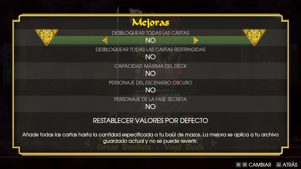 Todos los juegos de esta compilación tienen opciones que te permiten adelantarte para disfrutar duro y tendido, de lleno, la emoción de estos juegos. Por supuesto, puedes hacerla a la antigua, pero en los juegos viejitos se siente de verdad, un peso enorme a la hora de construir tu deck para poder jugar bien, por lo que estas opciones son bastante bien recibidas, y también la de hacer que el juego vaya un poco más rápido y fluido.